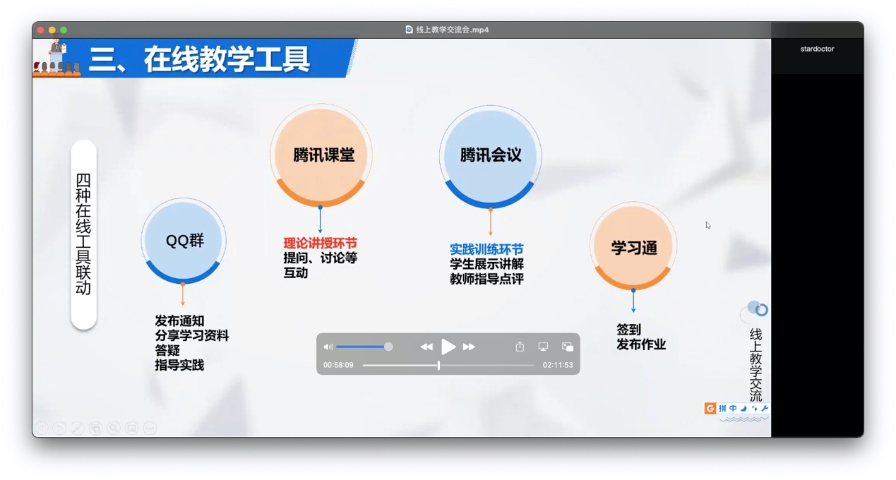 总而言之,线上教学的顺利进行,离不开教师们的辛勤付出,想尽一切办法,用自己的方式保证了教学环节的正常进行。疫情为我们设置阻碍的同时也创造了一个机会,各位教师需要结合此次分享,抓住线上教学机会,加强自己的课程资源建设,探索符合时代要求的教学方法、教学手段,从而更好的完成教学任务。