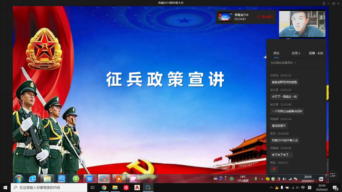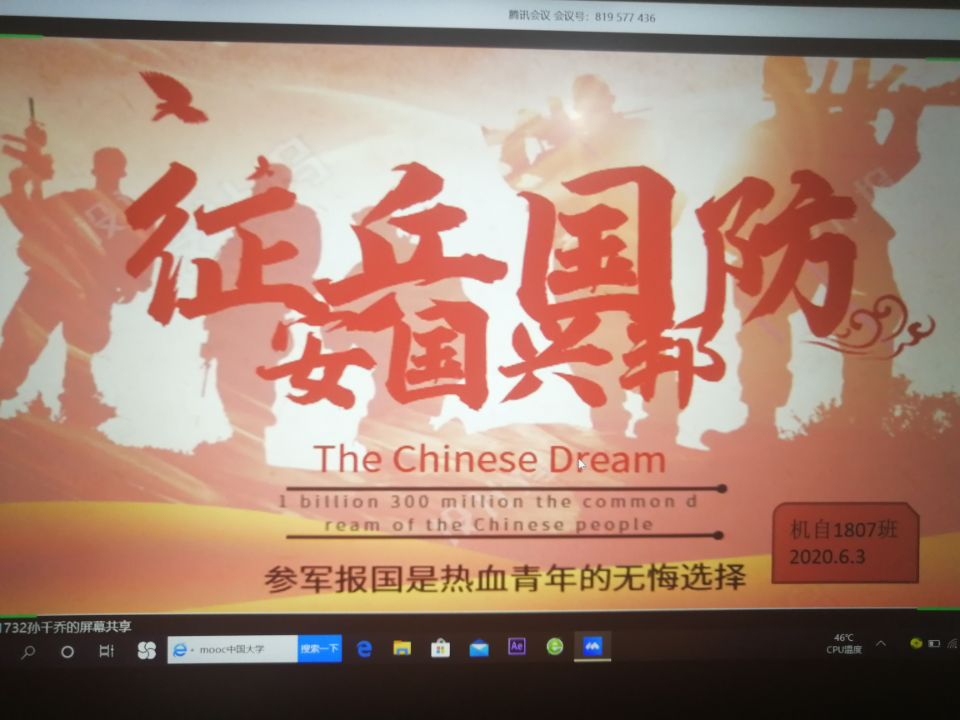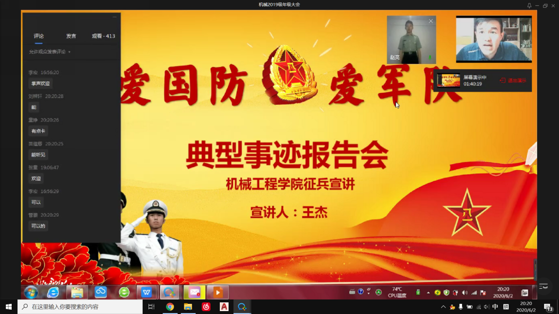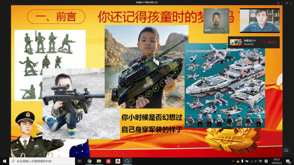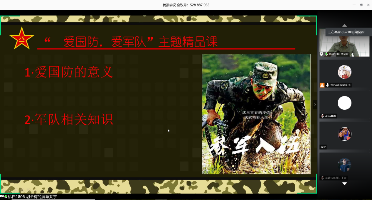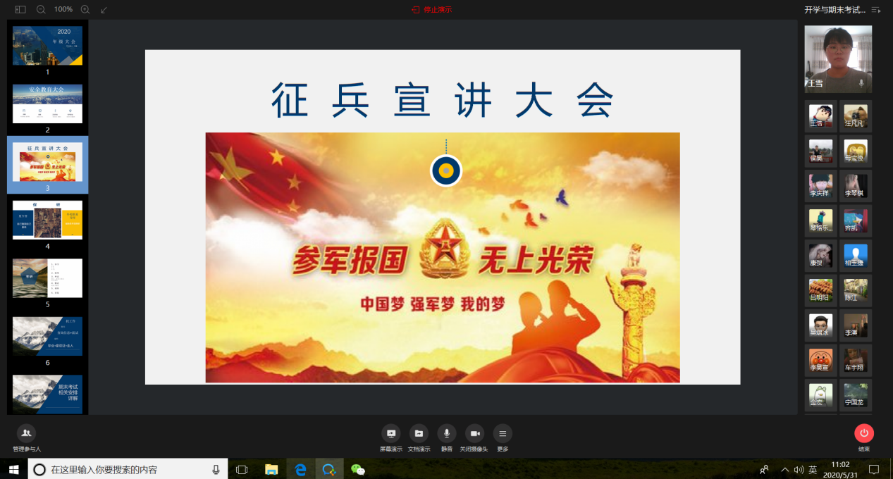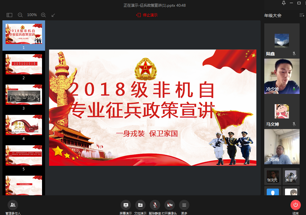 为深入贯彻落实2020国家及省、市老员工征兵工作要求,加大征兵工作的宣传力度,更加深入普及征兵政策,营造爱国强军的大学文化氛围,激发老员工爱国参军热情,营造老员工积极报名应征入伍携笔从戎的良好氛围。BB贝博艾弗森官网为将征兵政策传达到每一位同学,特成立由胡全有、王杰和冷少波三名同学组成的老员工征兵政策宣讲团,并于2020531日开始到65日截止,以年级大会的形式利用各线上平台展开“云”征兵宣传以及退役士兵典型事迹报告会。此次活动各年级辅导员分别担任年级大会主持人,邀请宣讲团成员宣讲。活动内容丰富,宣讲效果良好。
