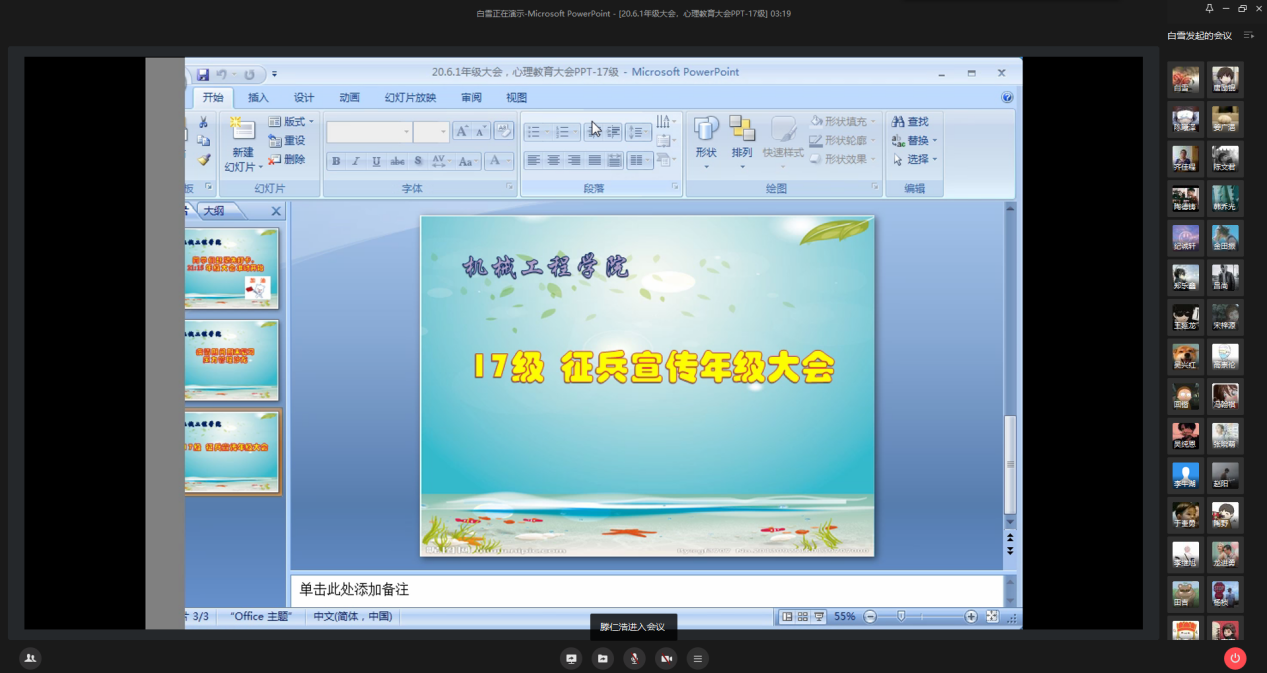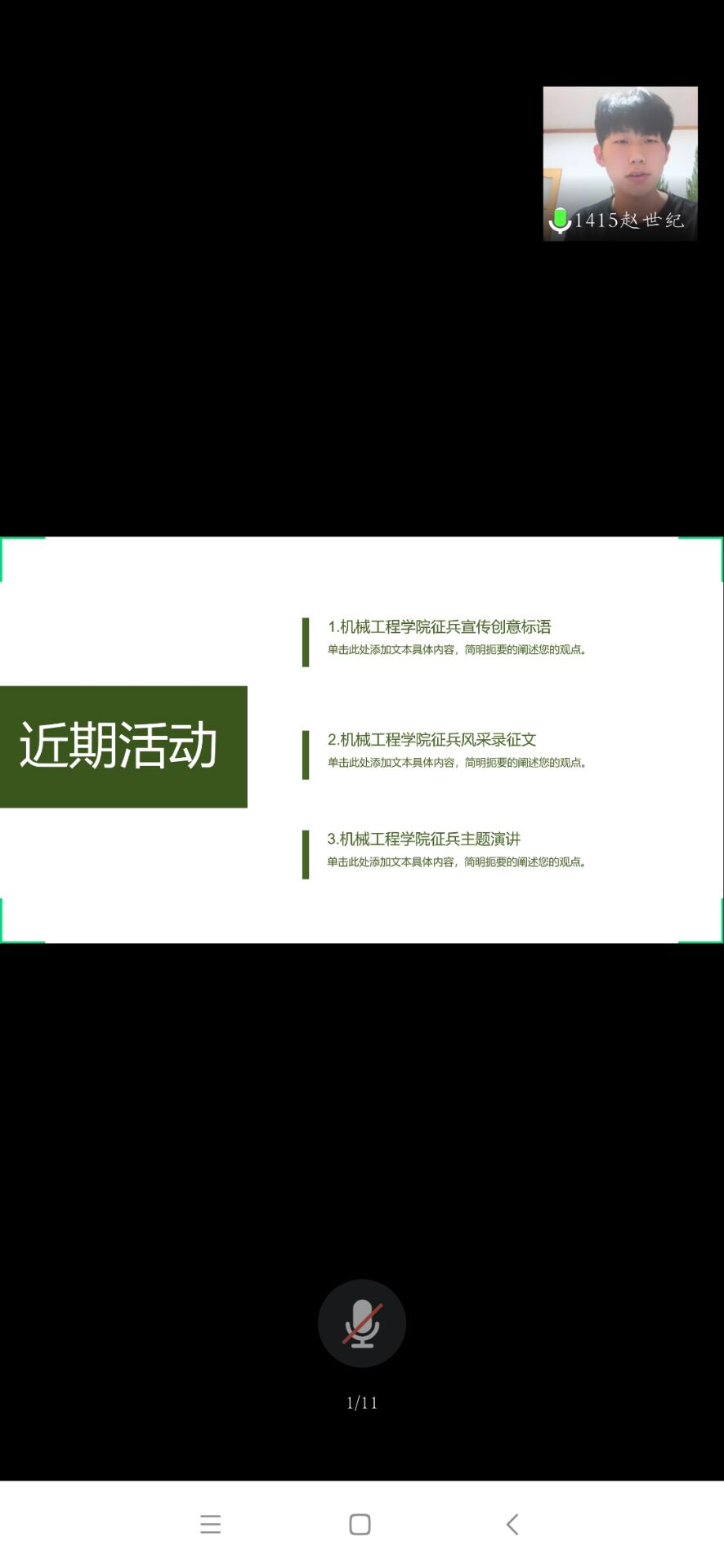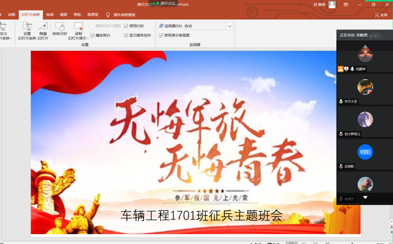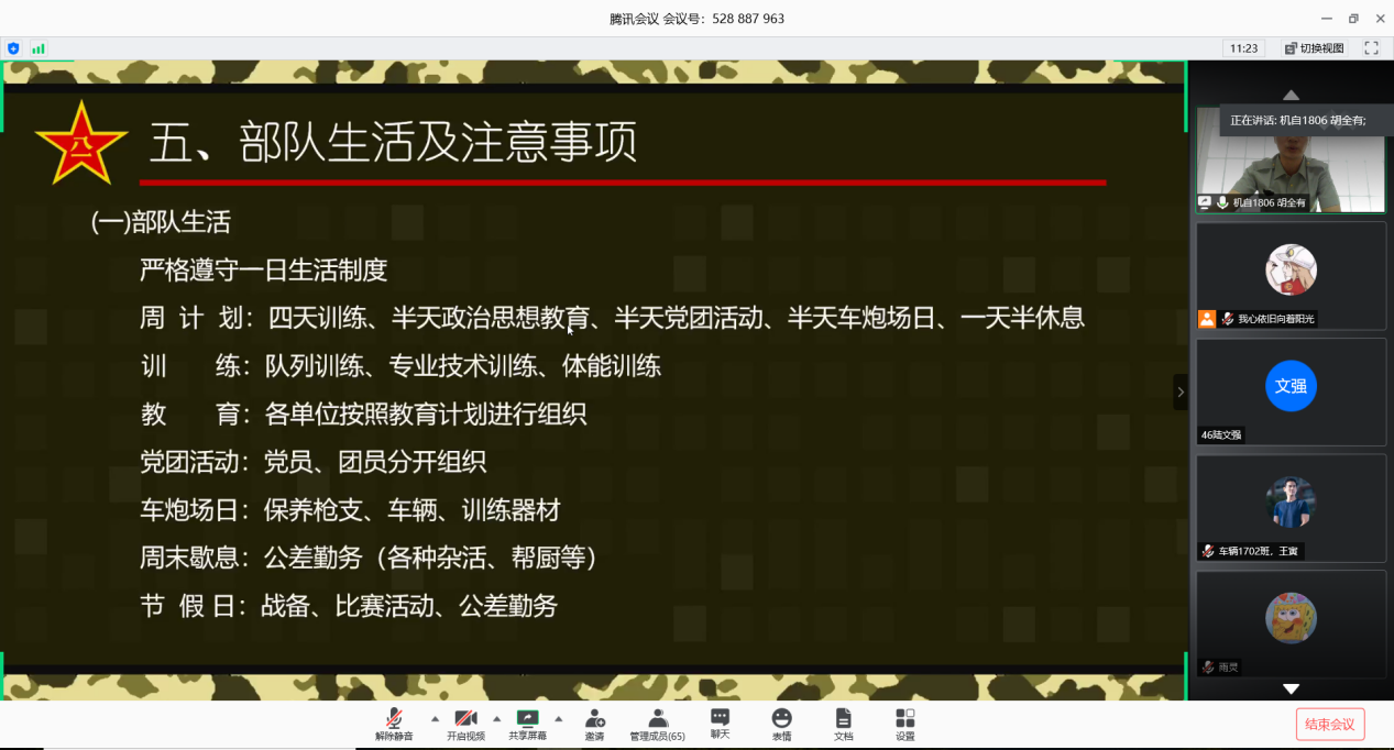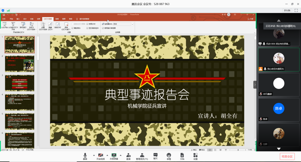 为深入贯彻落实2020国家及省、市老员工征兵工作要求,加大征兵工作的宣传力度,更加深入普及征兵政策,营造爱国强军的大学文化氛围,激发老员工爱国参军热情,营造老员工积极报名应征入伍携笔从戎的良好氛围。BB贝博艾弗森官网为将征兵政策传达到每一位同学,特成立由胡全有、王杰和冷少波三名同学组成的老员工征兵政策宣讲团,并于2020531日开始到65日截止,以年级大会的形式利用各线上平台展开“云”征兵宣传以及退役士兵典型事迹报告会。此次活动各年级辅导员分别担任年级大会主持人,邀请宣讲团成员宣讲。活动内容丰富,宣讲效果良好。