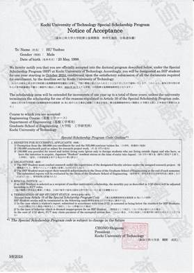 BB贝博艾弗森官网硕士研究生胡玉卓,经个人申请并通过日本高知工科大学评审,BB贝博艾弗森官网胡玉卓获日本高知工科大学 SSP(Special Scholarship Program) 全额奖学金资助,于2024年10月起以博士研究生身份在该校攻读学位,留学期限为三年。