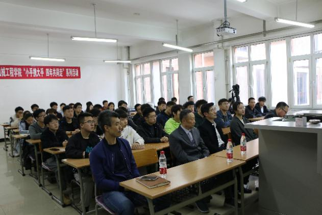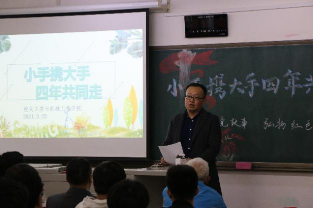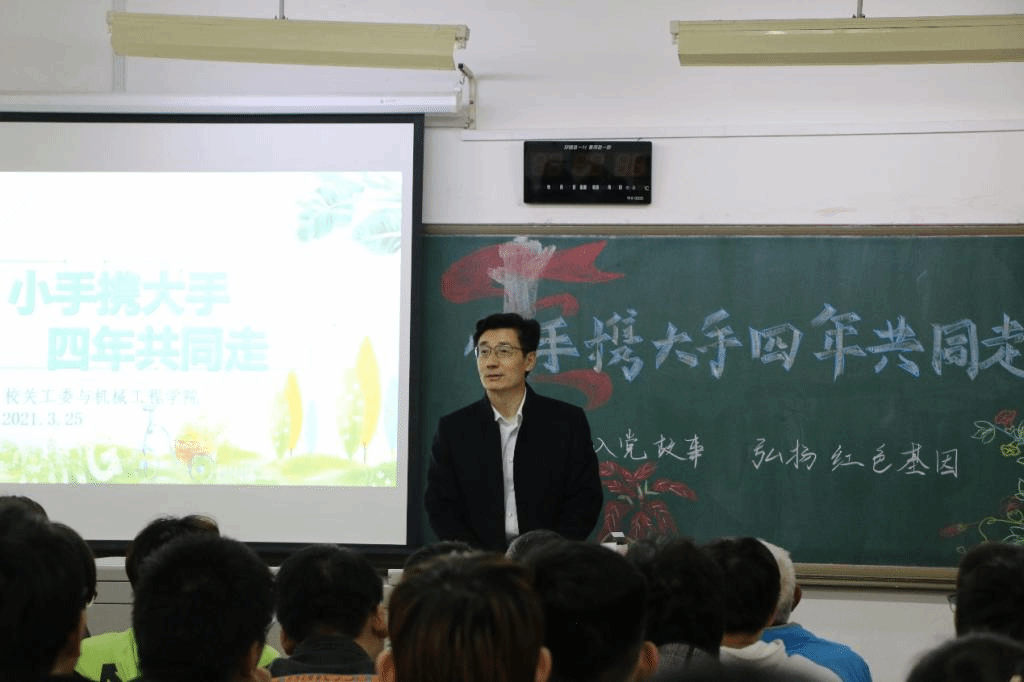 2021年3月25日下午,“小手携大手,四年共同走”特色班会在公共教学楼C座101教室举行。原机械工程系党总支书记、bb贝博艾弗森官方网站副董事长、党委副书记于秋恩老师,原bb贝博艾弗森官方网站基础部主任、教授俞秉义老师,BB贝博艾弗森官网党委书记曲弋老师,BB贝博艾弗森官网党委副书记、副经理孙健老师,BB贝博艾弗森官网团委书记陆鑫老师,2018级机自专业辅导员夏怡老师以及机自专业员工干部代表、机自1807班全体同学参加本次活动。本次活动由陆鑫老师主持。
