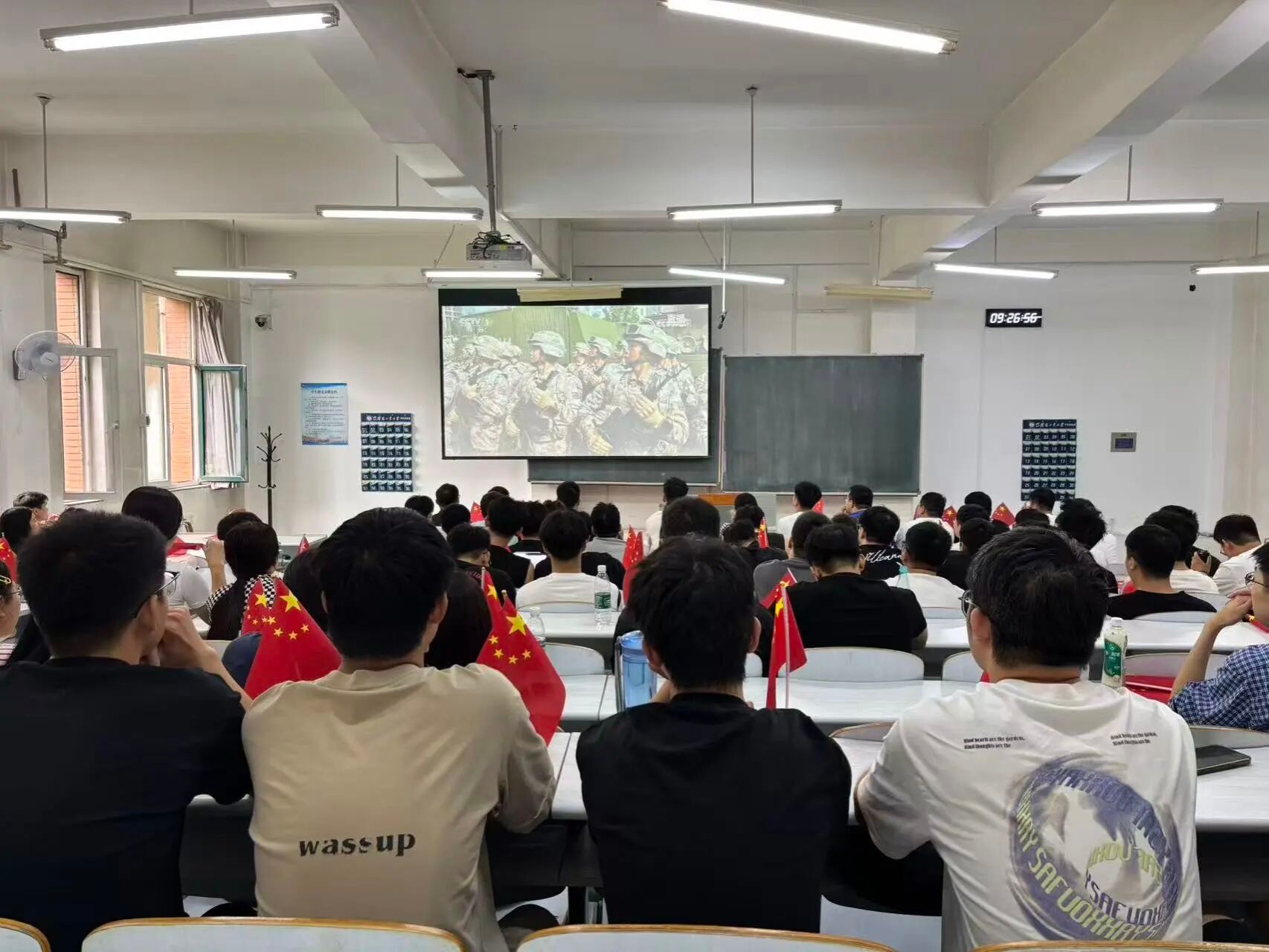 当庄严的国歌奏响,各分会场师生全体起立,高唱国歌,目光坚定而肃穆;随着镜头转向抗战老兵方阵,看到那些胸前挂满勋章、头发花白却依旧挺直脊梁的老战士,不少师生眼中泛起泪光--他们中既有亲历正面战场的老兵,也有参与敌后游击作战的老党员,岁月在他们脸上刻下皱纹,却从未磨灭那份保家卫国的赤诚。直播中,对中国人民抗日战争历程的回顾、对世界反法西斯战争东方主战场贡献的阐述,以及对和平发展理念的倡导,让师生们对“历史是最好的教科书”有了更深刻的理解。