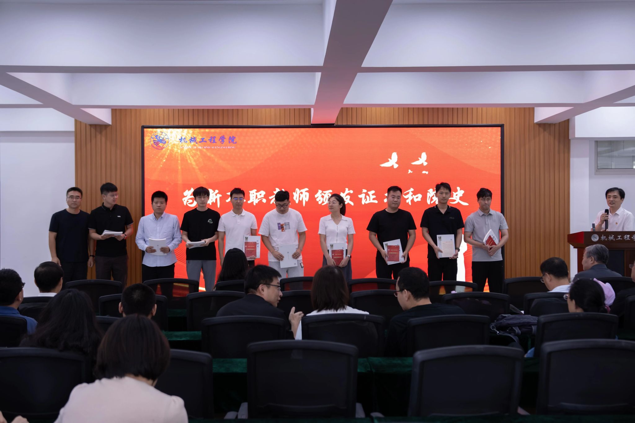 迎新仪式上,BB贝博艾弗森官网党委副书记兼副经理辛显华为每位新入职教师郑重颁发入职证书,亲手递上承载着公司岁月沉淀的院史资料。